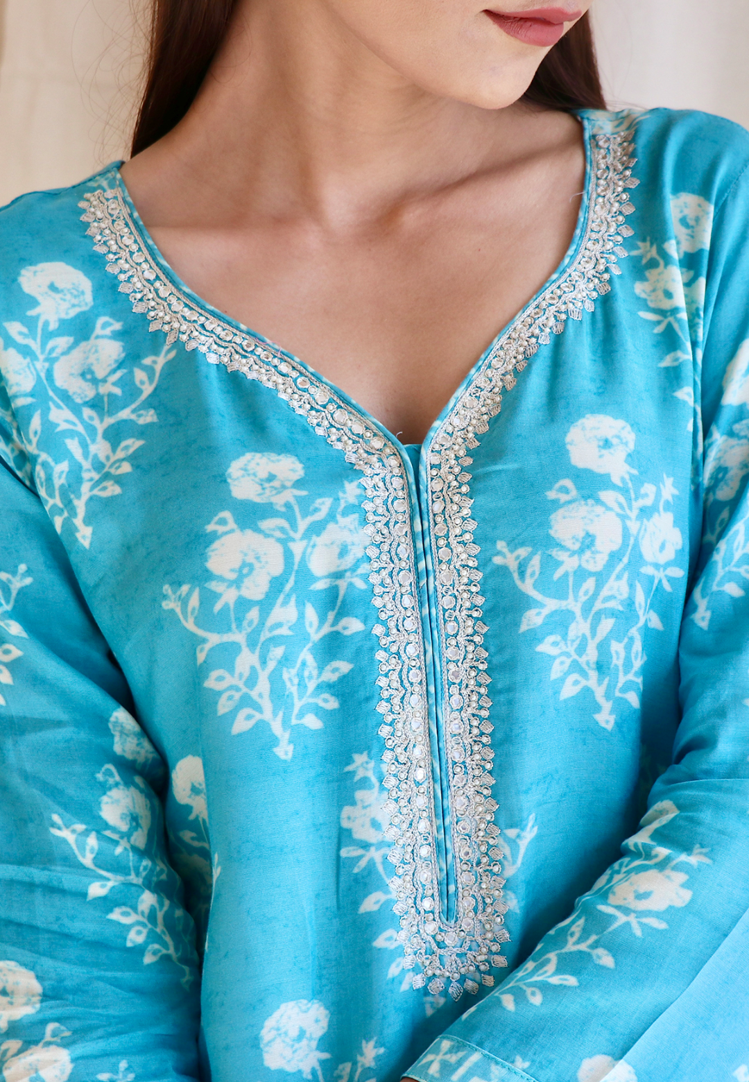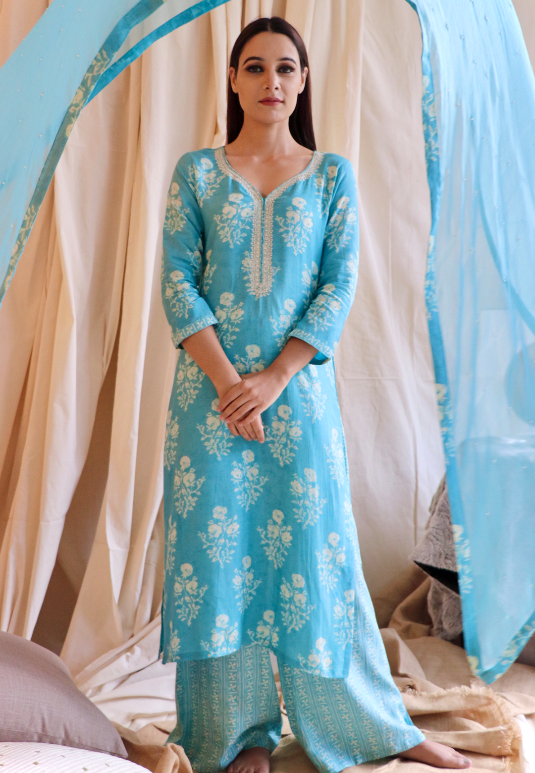 BLUE MUSLIN HAND-EMBROIDERED SUIT SET