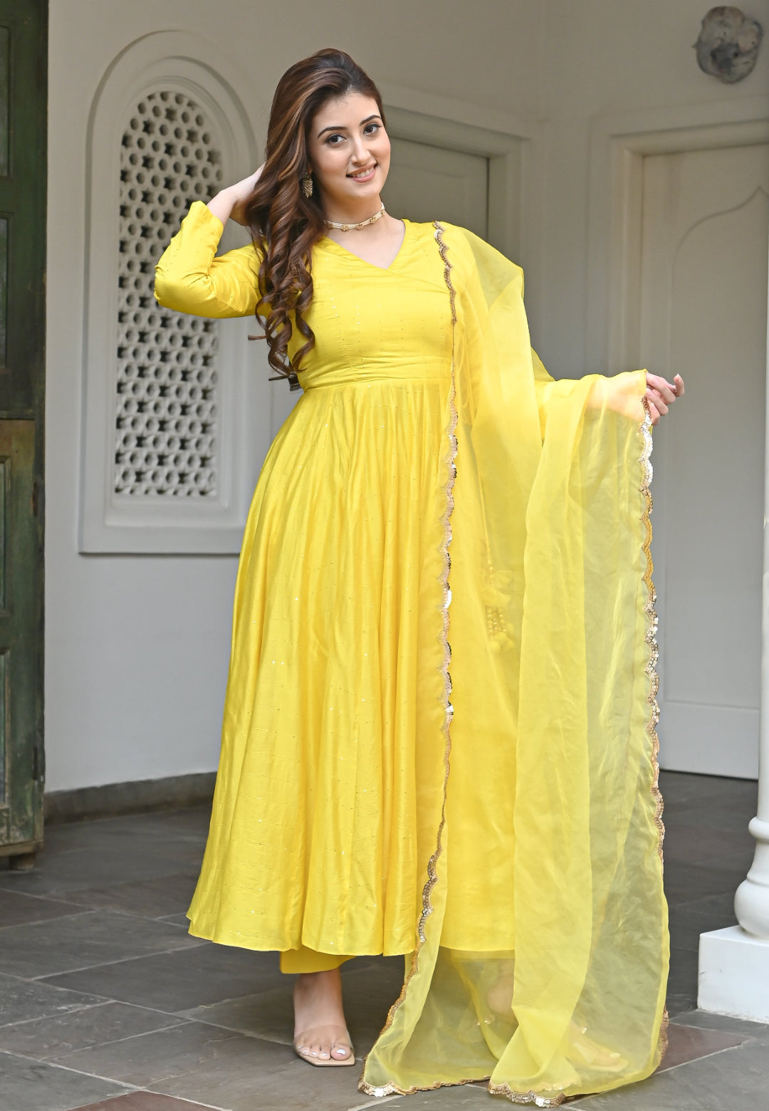 YELLOW CHANDERI SILK ANARKALI SET