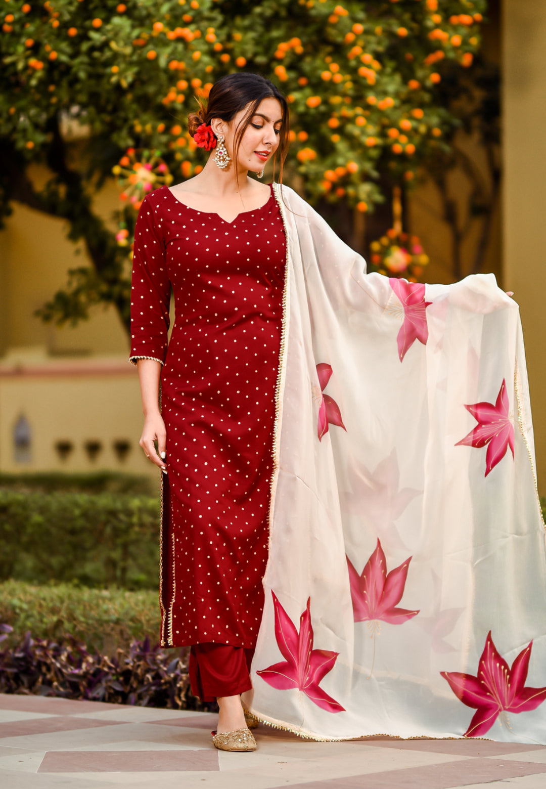 Set of 3 includes kurta, pants and dupatta.